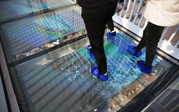 近期與“一踩就‘碎’的玻璃棧道”相關(guān)主題的短視頻在微博上瘋傳,眾多游客被玻璃破碎的痕跡及聲音嚇軟了腿,甚至尿褲子,讓人看了哭笑啼非的同時(shí),又忍不住瑟瑟發(fā)抖。原來,這是景區(qū)特意模擬玻璃“碎了”做出的技術(shù)效果,橋面安裝雷達(dá)設(shè)備,能夠感應(yīng)到人的步伐,在腳步落下時(shí),互動(dòng)式LED地磚屏?xí)霈F(xiàn)玻璃破碎的畫面,讓你走到哪兒,玻璃碎到哪兒,還伴隨著“咔嚓咔擦”的玻璃碎裂聲,聲效立體環(huán)繞,嚇到根本分不清碎裂的是玻璃,還是自己那顆脆弱的玻璃心